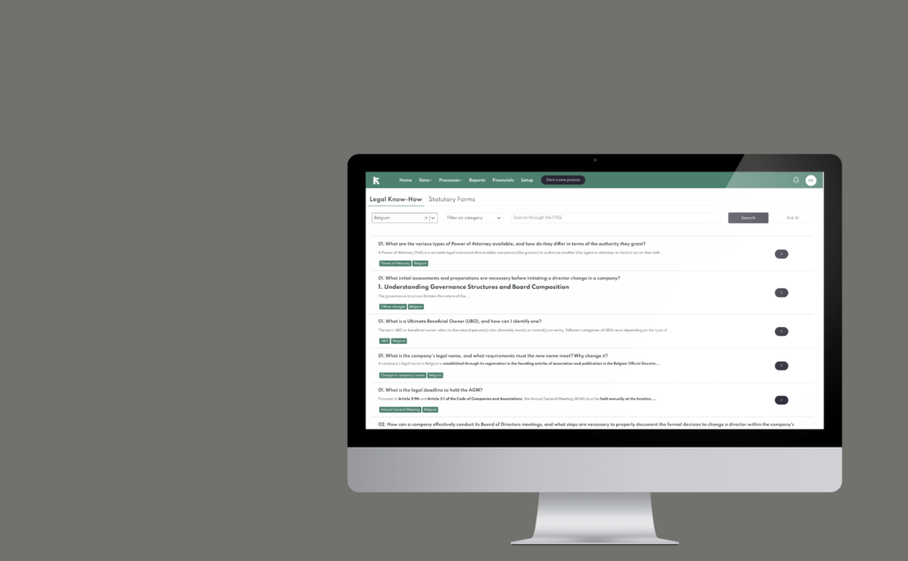 Stop relying on external advisors for routine compliance questions. Klea's Know-How module surfaces verified, legally reviewed guidance for 85+ jurisdictions – covering entity types, governance requirements, filing obligations, and key deadlines. Presented in plain, practical language, it gives your team the answers they need in seconds, not days.